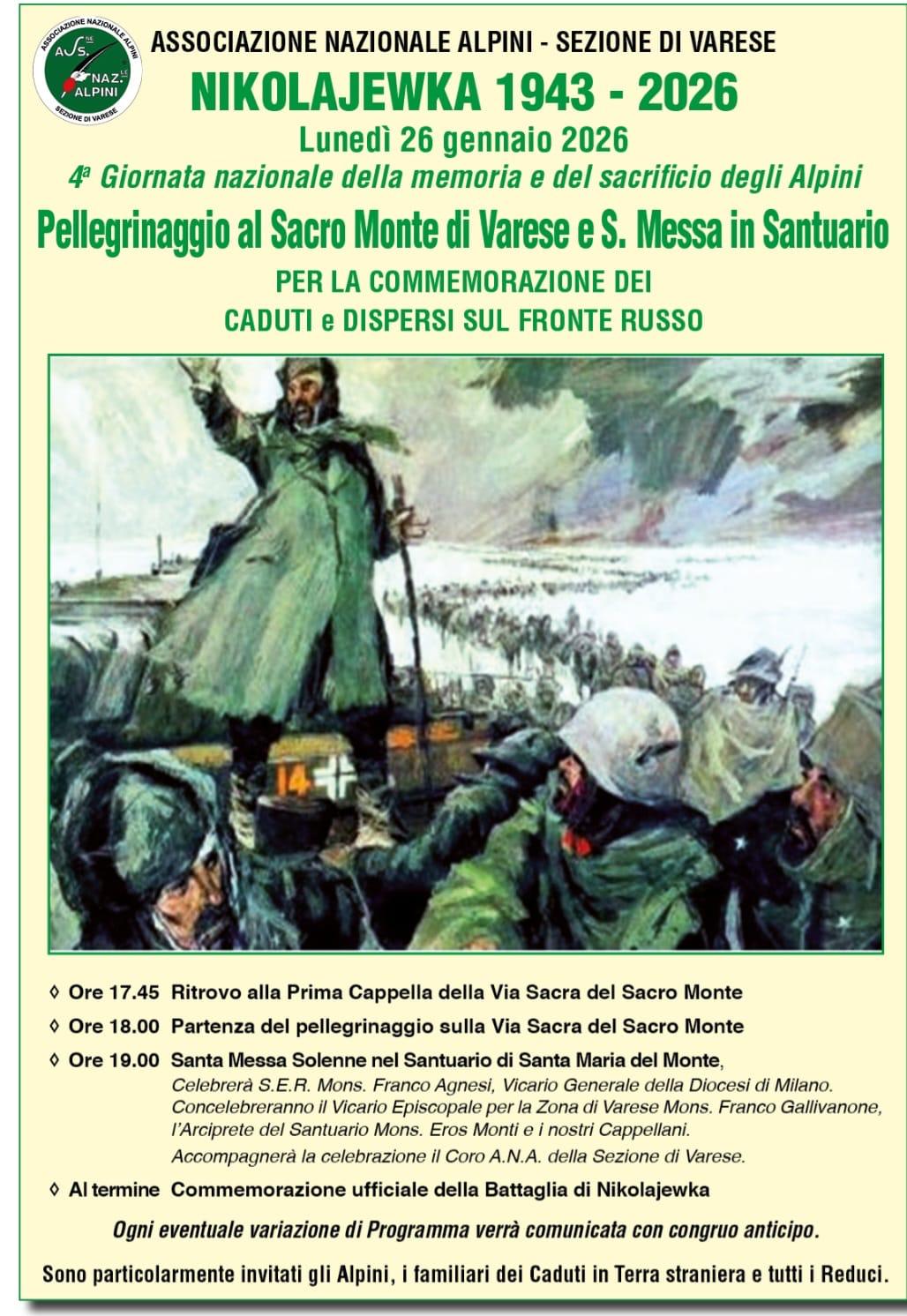 Lunedì 26 gennaio 2026 torna al Sacro Monte di Varese il pellegrinaggio degli Alpini per la commemorazione dei caduti e dispersi sul fronte russo: Nikolajewka 1943 - 2026.